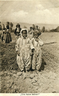 Die Vorderseite der Feldpostkarte zeigt einen Fotodruck einer Szene von zwei rauchenden Kindern vor einer Gruppe von Feldarbeitern. Die Bildunterschrift lautet "Uns kann keiner!". Auf der Rückseite befindet sich eine handschriftlich verfasste Nachricht von einem gewissen Vetter Franz an Fräulein Lisbeth Leonhardt in Landau (Pfalz). Der Feldpoststempel ist vom 6.9.1916. Verlag: Bahnhof- und Feldbuchhandelgesellschaft Berlin Im Historischen Museum der Pfalz war vom 29.4.2014 bis 24.9.2017 die Ausstellung "1914 - 1918. Die Pfalz im Ersten Weltkrieg" zu sehen. Auf einen öffentlichen Aufruf hin meldeten sich zahlreiche Privatpersonen, ihre Objekte wurden in dieser Sammlung erfasst und z. T. auch in der Ausstellung gezeigt. Die Objekte befinden sich im Eigentum der Privatpersonen und sind nicht Teil der Sammlungen des Historischen Museums der Pfalz.