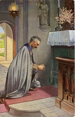 Die Vorderseite der Postkarte zeigt den Druck eines Gemäldes von C. Schmitt mit dem Titel "Stille Andacht". Dargestellt ist Kaiser Wilhelm II. während er beim Gebet vor dem Altar einer kleinen Kirche niederkniet. Auf der Rückseite ist der Text eines Gedichtes von H. v. Dittmar abgedruckt. Kunstverlag Hans Dietrich Abshagen, Dresden. Im Historischen Museum der Pfalz war vom 29.4.2014 bis 24.9.2017 die Ausstellung "1914 - 1918. Die Pfalz im Ersten Weltkrieg" zu sehen. Auf einen öffentlichen Aufruf hin meldeten sich zahlreiche Privatpersonen, ihre Objekte wurden in dieser Sammlung erfasst und z. T. auch in der Ausstellung gezeigt. Die Objekte befinden sich im Eigentum der Privatpersonen und sind nicht Teil der Sammlungen des Historischen Museums der Pfalz.