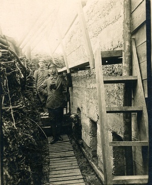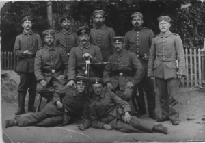 Die Deutsche Kriegerkarte Nr. 4 aus der Serie 1, "Vor dem Feinde", zeigt den Druck einer idealisierenden Szene, bei der im Bildvordergrund ein verwundeter deutscher Soldat von einem Feldarzt verbunden wird. Im mittleren Bildhintergrund ist ein weiterer deutscher Soldat dargestellt, welcher einen verwundeten französischen Soldaten stützend, in Richtung Feldarzt geht. Dahinter befinden sich auf einer Anhöhe Soldaten höherer Ränge, welche auf Pferden sitzend in Richtung Schlachtgeschehen zu blicken scheinen. Am unteren Bildrand sind die Worte "Sie schworen dem Kaiser Sieg und Mut und hielten den Eid mit ihrem Blut!" zu lesen. Kunstverlag Gerhard Stalling, Oldenburg Im Historischen Museum der Pfalz war vom 29.4.2014 bis 24.9.2017 die Ausstellung "1914 - 1918. Die Pfalz im Ersten Weltkrieg" zu sehen. Auf einen öffentlichen Aufruf hin meldeten sich zahlreiche Privatpersonen, ihre Objekte wurden in dieser Sammlung erfasst und z. T. auch in der Ausstellung gezeigt. Die Objekte befinden sich im Eigentum der Privatpersonen und sind nicht Teil der Sammlungen des Historischen Museums der Pfalz.