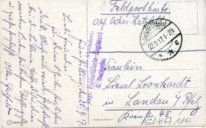 Die Vorderseite der Feldpostkarte zeigt den kolorierten Druck einer Blumenwiese. Auf der Rückseite befindet sich eine handschriftlich verfasste Nachricht von Jakob Hatzfeld, Soldat des 5. bayr. Feldartillerie-Regiments, 5. Batterie, an Fräulein Liesel Leonhardt in Landau (Pfalz) vom 20.9.1917. Der Feldpoststempel ist vom 22.9.1917. Im Historischen Museum der Pfalz war vom 29.4.2014 bis 24.9.2017 die Ausstellung "1914 - 1918. Die Pfalz im Ersten Weltkrieg" zu sehen. Auf einen öffentlichen Aufruf hin meldeten sich zahlreiche Privatpersonen, ihre Objekte wurden in dieser Sammlung erfasst und z. T. auch in der Ausstellung gezeigt. Die Objekte befinden sich im Eigentum der Privatpersonen und sind nicht Teil der Sammlungen des Historischen Museums der Pfalz.