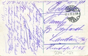 Die Vorderseite zeigt eine kolorierte Aufnahme des Albertplatz in Dresden. Auf der Rückseite befindet sich die handschriftlich verfasste Nachricht eines nicht zu identifizierenden Absenders an Fam. G. Leonhardt in Landau (Pfalz) vom 17.4.1917. Der Poststempel ist ebenfalls vom 17.4.1917. Im Historischen Museum der Pfalz war vom 29.4.2014 bis 24.9.2017 die Ausstellung "1914 - 1918. Die Pfalz im Ersten Weltkrieg" zu sehen. Auf einen öffentlichen Aufruf hin meldeten sich zahlreiche Privatpersonen, ihre Objekte wurden in dieser Sammlung erfasst und z. T. auch in der Ausstellung gezeigt. Die Objekte befinden sich im Eigentum der Privatpersonen und sind nicht Teil der Sammlungen des Historischen Museums der Pfalz.