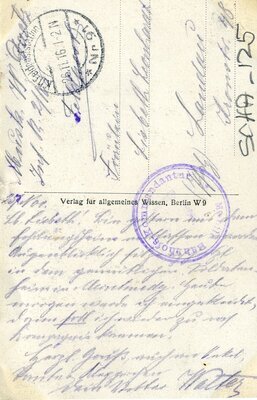 Die Vorderseite der Postkarte zeigt den Druck von einer Aufnahme eines deutschen Soldaten auf einer Brücke über die Chiers in der französischen Gemeinde Longuyon, heute im Département Meurthe-et-Moselle in der Region Lothringen gelegen. Der Ort wurde im Ersten Weltkrieg weitestgehend zerstört. Auf der Rückseite befindet sich die handschriftlich verfasste Nachricht von Musketier Walter Doetz an Fräulein Lisbeth Leonhardt in Landau (Pfalz) vom 25.11.1916. Der Poststempel ist vom 26.11.1916. Die Karte erschien im Verlag für allgemeines Wissen, Berlin W 9. Im Historischen Museum der Pfalz war vom 29.4.2014 bis 24.9.2017 die Ausstellung "1914 - 1918. Die Pfalz im Ersten Weltkrieg" zu sehen. Auf einen öffentlichen Aufruf hin meldeten sich zahlreiche Privatpersonen, ihre Objekte wurden in dieser Sammlung erfasst und z. T. auch in der Ausstellung gezeigt. Die Objekte befinden sich im Eigentum der Privatpersonen und sind nicht Teil der Sammlungen des Historischen Museums der Pfalz.
