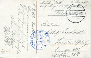 Die Vorderseite der Feldpostkarte zeigt drei Drucke von drei verschiedenen Aufnahmen einer soldatischen Abschiedsszene vor gleicher Hintergrundkulisse. Die obere Aufnahme ist beidseitig von einem Spruchband eingefasst. Darauf sind die Worte "Muss i denn muss i denn zum Städtele naus" des Volkslieds von Friedrich Silcher zu lesen. Zwischen den drei Aufnahmen ist jeweils ein dreigliedriger Zweig mit Eichenlaub positioniert, dessen unterer, zwischen den beiden unteren Aufnahmen positionierter Teil mit der dt. Reichsflagge geschmückt ist. Auf der Rückseite befindet sich eine handschritlich verfasste Nachricht von Musketier Walter Doetz, 5. Großherzoglich Hessisches Infanterie-Regiment 168, an Fräulein Lisbeth Leonhardt in Landau (Pfalz) vom 9.3.1917. Der Feldpoststempel ist vom 10.3.1917 Im Historischen Museum der Pfalz war vom 29.4.2014 bis 24.9.2017 die Ausstellung "1914 - 1918. Die Pfalz im Ersten Weltkrieg" zu sehen. Auf einen öffentlichen Aufruf hin meldeten sich zahlreiche Privatpersonen, ihre Objekte wurden in dieser Sammlung erfasst und z. T. auch in der Ausstellung gezeigt. Die Objekte befinden sich im Eigentum der Privatpersonen und sind nicht Teil der Sammlungen des Historischen Museums der Pfalz.