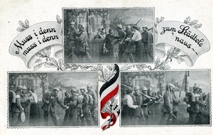 Die Vorderseite der Feldpostkarte zeigt drei Drucke von drei verschiedenen Aufnahmen einer soldatischen Abschiedsszene vor gleicher Hintergrundkulisse. Die obere Aufnahme ist beidseitig von einem Spruchband eingefasst. Darauf sind die Worte "Muss i denn muss i denn zum Städtele naus" des Volkslieds von Friedrich Silcher zu lesen. Zwischen den drei Aufnahmen ist jeweils ein dreigliedriger Zweig mit Eichenlaub positioniert, dessen unterer, zwischen den beiden unteren Aufnahmen positionierter Teil mit der dt. Reichsflagge geschmückt ist. Auf der Rückseite befindet sich eine handschritlich verfasste Nachricht von Musketier Walter Doetz, 5. Großherzoglich Hessisches Infanterie-Regiment 168, an Fräulein Lisbeth Leonhardt in Landau (Pfalz) vom 9.3.1917. Der Feldpoststempel ist vom 10.3.1917 Im Historischen Museum der Pfalz war vom 29.4.2014 bis 24.9.2017 die Ausstellung "1914 - 1918. Die Pfalz im Ersten Weltkrieg" zu sehen. Auf einen öffentlichen Aufruf hin meldeten sich zahlreiche Privatpersonen, ihre Objekte wurden in dieser Sammlung erfasst und z. T. auch in der Ausstellung gezeigt. Die Objekte befinden sich im Eigentum der Privatpersonen und sind nicht Teil der Sammlungen des Historischen Museums der Pfalz.