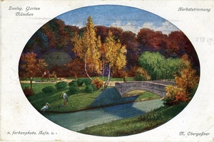 Die Vorderseite der Postkarte zeigt den kolorierten Druck einer oval eingerahmten, herbstlichen Szene aus dem zoologischen Garten in München nach einer farbenphoto. Aufnahme v. M. Obergaßner. Auf der Rückseite befindet sich die handschriftlich verfasste Nachricht eines gewissen Oberfeuerwerker Bald/Baer (?), Artilleriergt. Landau z.z. in München, an Fräulein Lisbeth Leonhardt in Landau (Pfalz). Der Feldpoststempel ist vom 26.9.1917. Im Historischen Museum der Pfalz war vom 29.4.2014 bis 24.9.2017 die Ausstellung "1914 - 1918. Die Pfalz im Ersten Weltkrieg" zu sehen. Auf einen öffentlichen Aufruf hin meldeten sich zahlreiche Privatpersonen, ihre Objekte wurden in dieser Sammlung erfasst und z. T. auch in der Ausstellung gezeigt. Die Objekte befinden sich im Eigentum der Privatpersonen und sind nicht Teil der Sammlungen des Historischen Museums der Pfalz.