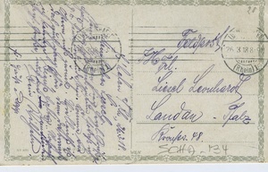 Die Vorderseite der Feldpostkarte zeigt den kolorierten Druck einer herbstlichen Szene mit Haus und Brücke über einen Fluss. Auf der Rückseite befindet sich eine handschriftlich verfasste Nachricht von Wilhelm Rapp (?) in Ludwigshafen am Rhein an Fräulein Liesel Leonhardt in Landau (Pfalz) vom 26.3.1918. Der Poststempel ist ebenfalls vom 26.3.1918. Verlag Wenau-Postkarte Im Historischen Museum der Pfalz war vom 29.4.2014 bis 24.9.2017 die Ausstellung "1914 - 1918. Die Pfalz im Ersten Weltkrieg" zu sehen. Auf einen öffentlichen Aufruf hin meldeten sich zahlreiche Privatpersonen, ihre Objekte wurden in dieser Sammlung erfasst und z. T. auch in der Ausstellung gezeigt. Die Objekte befinden sich im Eigentum der Privatpersonen und sind nicht Teil der Sammlungen des Historischen Museums der Pfalz.