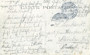 Die Vorderseite der Postkarte zeigt den Druck einer Ansicht der „Grand' Place“ (heute „Place du Général du Gaulle“) in Lille um 1900. Am rechten Rand erhebt sich die 1845 eingeweihte „Colonne de la Déesse“ (Säule der Göttin), die an die erfolglose Belagerung von Lille im Jahr 1792 durch die Armee des Heiligen Römischen Reiches während der Französischen Revolution erinnert. Prominent werden die damals gerade eingeführten elektrifizierten Straßenbahnen in Szene gesetzt. Die Reklameschilder auf den Triebwägen werben für das „Bock Tartarat“, einem Bier aus der ortsansässigen Brauerei „La Lilloise“, die 1898 von Stéphane Tartarat gegründet wurde, den Ersten Weltkrieg aber nicht überstand. Auf der Rückseite der Karte befindet sich eine handschriftlich verfasste Nachricht des deutschen Gefreiten Hatzfeld (5. Königlich Bayrisches Feldartillerie Regiment in Landau) an Fräulein Lisbeth Leonhardt in Landau (Pfalz). Der Poststempel ist vom 25.2.1916. Gedruckt wurde die Postkarte im Verlag Verhoeve in Roubaix. [Johanna Kätzel] Im Historischen Museum der Pfalz war vom 29.4.2014 bis 24.9.2017 die Ausstellung "1914 - 1918. Die Pfalz im Ersten Weltkrieg" zu sehen. Auf einen öffentlichen Aufruf hin meldeten sich zahlreiche Privatpersonen, ihre Objekte wurden in dieser Sammlung erfasst und z. T. auch in der Ausstellung gezeigt. Die Objekte befinden sich im Eigentum der Privatpersonen und sind nicht Teil der Sammlungen des Historischen Museums der Pfalz.