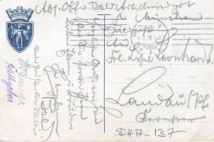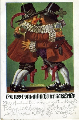 Die Vorderseite der Postkarte zeigt den kolorierten Druck einer Zeichnung des Künstlers M. Luber. Unter der Darstellung zweier Trinkbrüder befindet sich die Aufschrift "Gruss vom Müchener Ratskeller"; darunter eine handschriftlich verfasste Notiz. Auf der Rückseite befindet sich eine handschriftlich verfasste Nachricht von Oberfeuerwerker Bald/Baer (?) in München an Fräulein Lisel Leonhardt in Landau (Pfalz). Der Poststempel ist vom 4.3.1918. Im Historischen Museum der Pfalz war vom 29.4.2014 bis 24.9.2017 die Ausstellung "1914 - 1918. Die Pfalz im Ersten Weltkrieg" zu sehen. Auf einen öffentlichen Aufruf hin meldeten sich zahlreiche Privatpersonen, ihre Objekte wurden in dieser Sammlung erfasst und z. T. auch in der Ausstellung gezeigt. Die Objekte befinden sich im Eigentum der Privatpersonen und sind nicht Teil der Sammlungen des Historischen Museums der Pfalz.