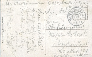 Die Vorderseite der Postkarte zeigt eine kolorierte Aufnahme des Rathauses in München. Auf der Rückseite befindet sich eine handschriftlich verfasste Nachricht von Wilhelm Weindt(l)er, Oberfeuerwerker Bayr./Bad. (?) Artillerieregimet in München an Oberfeuerwerker Wilhelm Gelbach (?) beim Artillerieregiment in Landau (Pfalz). Der Poststempel ist vom 24.2.1918. Postkartenverlag Bavaria, München Im Historischen Museum der Pfalz war vom 29.4.2014 bis 24.9.2017 die Ausstellung "1914 - 1918. Die Pfalz im Ersten Weltkrieg" zu sehen. Auf einen öffentlichen Aufruf hin meldeten sich zahlreiche Privatpersonen, ihre Objekte wurden in dieser Sammlung erfasst und z. T. auch in der Ausstellung gezeigt. Die Objekte befinden sich im Eigentum der Privatpersonen und sind nicht Teil der Sammlungen des Historischen Museums der Pfalz.