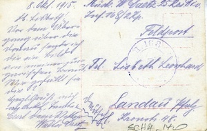 Die Vorderseite der Feldpostkarte zeigt den Druck einer Portraitaufnahme von einer jungen Dame mit Band im Haar. Auf der Rückseite befindet sich eine handschriftlich verfasste Nachricht von Musketier Walter Doetz, 25. Res. Divison Inf. Rgt. 168/2. Kompanie, an Fräulein Lisbeth Leonhardt in Landau (Pfalz) vom 8.10.1915. Der Feldpoststempel ist ebenfalls vom 8.10.1915. Im Historischen Museum der Pfalz war vom 29.4.2014 bis 24.9.2017 die Ausstellung "1914 - 1918. Die Pfalz im Ersten Weltkrieg" zu sehen. Auf einen öffentlichen Aufruf hin meldeten sich zahlreiche Privatpersonen, ihre Objekte wurden in dieser Sammlung erfasst und z. T. auch in der Ausstellung gezeigt. Die Objekte befinden sich im Eigentum der Privatpersonen und sind nicht Teil der Sammlungen des Historischen Museums der Pfalz.