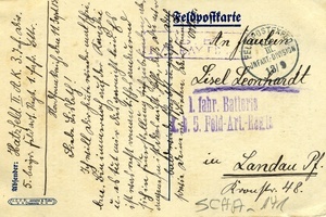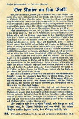 Die Vorderseite der Postkarte zeigt den Abdruck eines Auszuges aus einem Aufruf des Kaisers an das deutsche Volk aus dem Großen Hauptquartier vom 31. Juli 1915. Auf der Rückseite befindet sich eine handschriftlich verfasste Nachricht von Jakob Hatzfeld, II. A.K. 3. Inf. Div. 5. bayr. Feldart. Rgt. 1. fahr. Batt., in Nordfr...kreis (Ort unleselich), an Fräulein Lisbeth Leonhardt in Landau (Pfalz) vom 11.9.1915. Der Feldpoststempel ist ebenfalls vom 13.9.1915. Verlag J.C.F Pickenhahn & Sohn Chemnitz Im Historischen Museum der Pfalz war vom 29.4.2014 bis 24.9.2017 die Ausstellung "1914 - 1918. Die Pfalz im Ersten Weltkrieg" zu sehen. Auf einen öffentlichen Aufruf hin meldeten sich zahlreiche Privatpersonen, ihre Objekte wurden in dieser Sammlung erfasst und z. T. auch in der Ausstellung gezeigt. Die Objekte befinden sich im Eigentum der Privatpersonen und sind nicht Teil der Sammlungen des Historischen Museums der Pfalz.
