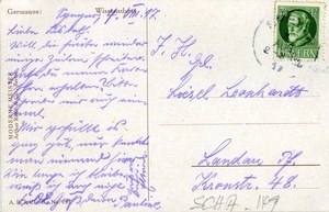 Die Vorderseite der Postkarte zeigt den Druck eines Gemäldes des Künstlers "Germanus" mit dem Titel "Wissensdurst" aus der Reihe "Moderne Meister". Dargestellt ist eine junge Frau mit einem aufgeschlagenen Buch in der Hand vor einem Bücherschrank. Auf der Rückseite befindet sich eine handschriftlich verfasste Nachricht einer gewissen "Pauline" aus Speyer an Fräulein Lisbeth Leonhardt in Landau (Pfalz) vom 4.8.1917. Der Poststempel ist unleserlich. Verlag Arthur Schürer & Co., B.-Schöneberg Im Historischen Museum der Pfalz war vom 29.4.2014 bis 24.9.2017 die Ausstellung "1914 - 1918. Die Pfalz im Ersten Weltkrieg" zu sehen. Auf einen öffentlichen Aufruf hin meldeten sich zahlreiche Privatpersonen, ihre Objekte wurden in dieser Sammlung erfasst und z. T. auch in der Ausstellung gezeigt. Die Objekte befinden sich im Eigentum der Privatpersonen und sind nicht Teil der Sammlungen des Historischen Museums der Pfalz.