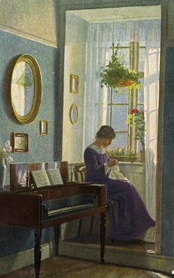 Die Vorderseite der Postkarte zeigt den Druck eines Gemäldes des Künstlers Alfred Broge mit dem Titel "Im Erker (Majsolen titter ind)" aus der Reihe "Dänische Kunst". Dargestellt ist eine, in einem Erker sitzende Frau beim Stricken". Auf der Rückseite befindet sich eine handschriftlich verfasste Nachricht von Oberfeuerwerker Wilhelm Gelbach, Art. Rgt. Landau, an Fräulein Lisbeth Leonhardt in Landau (Pfalz). Der Poststempel ist vom 15.8.1917 in Frankenthal. Verlag Arthur Schürer & Co., B.-Schönberg. Im Historischen Museum der Pfalz war vom 29.4.2014 bis 24.9.2017 die Ausstellung "1914 - 1918. Die Pfalz im Ersten Weltkrieg" zu sehen. Auf einen öffentlichen Aufruf hin meldeten sich zahlreiche Privatpersonen, ihre Objekte wurden in dieser Sammlung erfasst und z. T. auch in der Ausstellung gezeigt. Die Objekte befinden sich im Eigentum der Privatpersonen und sind nicht Teil der Sammlungen des Historischen Museums der Pfalz.