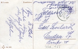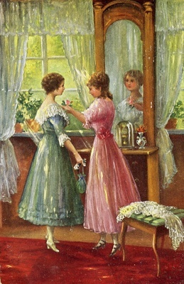 Die Vorderseite der Postkarte zeigt den Druck eines Gemäldes des Künstlers M. Loeske mit dem Titel "Evastöchter". Dargestellt sind zwei Damen vor einem Spiegel. Auf der Rückseite befindet sich eine handschriftlich verfasste Nachricht von Oberfeuerwerker Wilhelm Gelbach in Frankenthal, Art. Rgt. Landau, an Fräulein Lisbeth Leonhardt in Landau (Pfalz). Der Poststempel aus Frankenthal ist vom 11.7.1917. Im Historischen Museum der Pfalz war vom 29.4.2014 bis 24.9.2017 die Ausstellung "1914 - 1918. Die Pfalz im Ersten Weltkrieg" zu sehen. Auf einen öffentlichen Aufruf hin meldeten sich zahlreiche Privatpersonen, ihre Objekte wurden in dieser Sammlung erfasst und z. T. auch in der Ausstellung gezeigt. Die Objekte befinden sich im Eigentum der Privatpersonen und sind nicht Teil der Sammlungen des Historischen Museums der Pfalz.