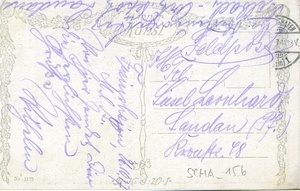 Die Vorderseite der Postkarte zeigt den Druck eines Gemäldes des Künstlers Oskar Grill mit dem Titel "Der Gärtner (Le jardinier)". Dargestellt ist ein Mann mit Hut, Weste und Schürze, der mit einem Blumentopf in der Hand in einem Garten steht. Auf der Rückseite befindet sich eine handschriftlich verfasste Nachricht von Oberfeuerwerker Wilhelm Gelbach in Freinsheim, Art. Depot Landau, an Fräulein Lisbeth Leonhardt in Landau (Pfalz) vom 26.10.1917. Das Datum des Poststempels aus Ludwigshafen (Rhein) ist verblichen. Im Historischen Museum der Pfalz war vom 29.4.2014 bis 24.9.2017 die Ausstellung "1914 - 1918. Die Pfalz im Ersten Weltkrieg" zu sehen. Auf einen öffentlichen Aufruf hin meldeten sich zahlreiche Privatpersonen, ihre Objekte wurden in dieser Sammlung erfasst und z. T. auch in der Ausstellung gezeigt. Die Objekte befinden sich im Eigentum der Privatpersonen und sind nicht Teil der Sammlungen des Historischen Museums der Pfalz.
