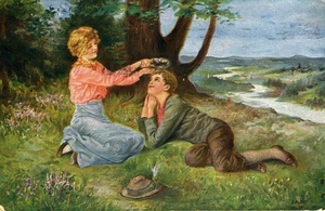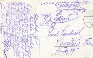 Die Vorderseite der Postkarte zeigt den Druck eines Gemäldes eines unbekannten Künstlers. Dargestellt ist ein Soldat mit Krücke, der zusammen mit einer Dame auf einem Weg am Fluss spaziert. Im Hintergrund befindet sich eine alte Brücke vor einer Stadtkulisse. Darunter ist ein Gedicht von Hoffman von Fallersleben mit dem Titel "Glück der Liebe" abgedruckt. Auf der Rückseite befindet sich eine handschriftlich verfasste Nachricht von Oberfeuerwerker Wilhelm Gelbach in Ludwigshafen (Rhein), Art. Depot Landau, an Fräulein Lisbeth Leonhardt in Landau (Pfalz) vom 2.4.1918. Das Datum des Poststempels aus Ludwigshafen ist ebenfalls der 2.4.1918. Im Historischen Museum der Pfalz war vom 29.4.2014 bis 24.9.2017 die Ausstellung "1914 - 1918. Die Pfalz im Ersten Weltkrieg" zu sehen. Auf einen öffentlichen Aufruf hin meldeten sich zahlreiche Privatpersonen, ihre Objekte wurden in dieser Sammlung erfasst und z. T. auch in der Ausstellung gezeigt. Die Objekte befinden sich im Eigentum der Privatpersonen und sind nicht Teil der Sammlungen des Historischen Museums der Pfalz.