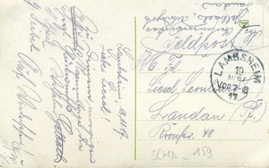 Die Vorderseite der Postkarte zeigt den kolorierten Druck einer Rose. Auf der Rückseite befindet sich eine handschriftlich verfasste Nachricht von Oberfeuerwerker Wilhelm Gelbach in Lambsheim, Art. Depot Landau, an Fräulein Lisbeth Leonhardt in Landau (Pfalz) vom 18.11.1917. Das Datum des Poststempels aus Lambsheim ist der 19.11.1917. Im Historischen Museum der Pfalz war vom 29.4.2014 bis 24.9.2017 die Ausstellung "1914 - 1918. Die Pfalz im Ersten Weltkrieg" zu sehen. Auf einen öffentlichen Aufruf hin meldeten sich zahlreiche Privatpersonen, ihre Objekte wurden in dieser Sammlung erfasst und z. T. auch in der Ausstellung gezeigt. Die Objekte befinden sich im Eigentum der Privatpersonen und sind nicht Teil der Sammlungen des Historischen Museums der Pfalz.