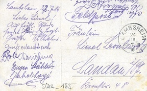 Die Vorderseite der Postkarte zeigt den Druck eines Gemäldes eines unbekannten Künstlers. Dargestellt ist eine verschneite Winterlandschaft mit Bach bei Sonnenuntergang. Auf der Rückseite befindet sich eine handschriftlich verfasste Nachricht von Oberfeuerwerker Wilhelm Gelbach in Lambsheim, Art. Rgt Landau Abt. Depot, an Fräulein Lisbeth Leonhardt in Landau (Pfalz) vom 22.7.1916. Der Poststempel ist vom 24.7.1916 in Lambsheim. Im Historischen Museum der Pfalz war vom 29.4.2014 bis 24.9.2017 die Ausstellung "1914 - 1918. Die Pfalz im Ersten Weltkrieg" zu sehen. Auf einen öffentlichen Aufruf hin meldeten sich zahlreiche Privatpersonen, ihre Objekte wurden in dieser Sammlung erfasst und z. T. auch in der Ausstellung gezeigt. Die Objekte befinden sich im Eigentum der Privatpersonen und sind nicht Teil der Sammlungen des Historischen Museums der Pfalz.