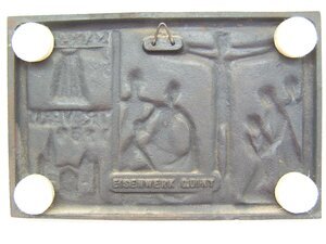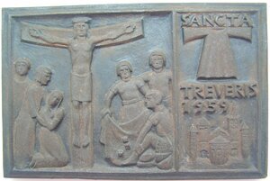 Rechteckige Eisengussplakette, die das Eisenwerk Quint anläßlich der Ausstellung des heiligen Rocks in Trier 1959 als Reliefbild hergestellt hat. Die Platte mit einem profilierten Rand ist in zwei ungleich große Felder eingeteilt. In dem größeren Bildfeld links (11 x 10,5 cm) ist die Kreuzigungsszene dargestellt. Links neben dem Kreuz kniet die betende Maria, zwei Apostel (einer ist laut der Bibelüberlieferung der Apostel Johannes) stehen ihr zur Seite. Neben dem Kreuz rechts würofeln drei römische Soldaten um das nahtlose Gewand, das einer der Soldaten hälttIn dem kleineren Bildfeld links (11 x 5,5 cm) sehen wir oben den ausgebreiteten heiligen Rock, darunter den Trierer Dom St. Peter. Hier befindet sich auch die Inschrift "SANCTA / TREVERIS / 1959". Die Rückseite zeigt die Negativformen der Bilder der Vorderseite sowie den Schriftzug "Eisenwerk Quint" und eine Vorrichtung für einen Haken zum Aufhängen der Plakette.