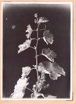 Zu sehen ist der Trieb einer Rebe (Riesling) welcher von Mehltau befallen ist. Der Mehltauerreger war ursprünglich in Nordamerika beheimatet. Auf den dortigen Wildreben verursacht er wenig Schäden. Seit 1845 tritt er in Europa an Kulturreben auf, wo er große wirtschaftliche Schäden insbesondere durch die Beeinträchtigung der Qualität der erzeugten Weine verursacht. Das Foto stammt aus der ehemaligen Landes-Lehr- und Versuchsanstalt (LLVA) in Bernkastel Kues.