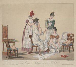 Die wechselnden Herrschaftsverhältnisse im Frankreich des 19. Jahrhunderts und die häufigen Einschränkungen der Meinungs- und Pressefreiheit führten dazu, dass sich viele Herausgeber von Karikaturen eher auf unverfängliche Sozialsatiren fokussierten. Bei Paul-André Basset erschienen etwa zahlreiche Blätter aus dem häuslichen Umfeld oder aus dem Bereich der Mode. Gerade manche Auswüchse des Mode- und Schönheitswahns der damaligen Zeit lieferten Steilvorlagen für Karikaturisten. So waren die im frühen 19. Jahrhundert in Mode gekommenen hautengen Hosen nicht gerade für Jedermann geeignet. Nicht nur für Übergewichtige erschienen solche Hosen unvorteilhaft. Wer etwa nicht entsprechend wohlgeformte und zu dünne Beine hatte, dem wurde (ernsthaft) empfohlen, Waden und Oberschenkel auszupolstern. Der Karikaturist des vorliegenden Blattes stellt die modischen Hosen als derart eng dar, dass fünf Personen und zwei Seilwinden nötig sind, um die Beinkleider überhaupt anziehen zu können. [Johanna Kätzel]