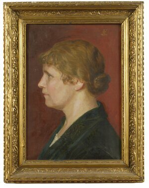 Selbstporträt des Studienprofessors Friedrich Ulm, der sich zusammen mit seiner Gattin im bürgerlichen Wohnzimmer vor der Staffelei darstellt. Er trägt einem blauen Anzug mit weißem Hemd mit Stehkragen und Krawatte. In der Linken hält Ulm drei Pinsel und eine Palette. An seiner linken Seite steht seine Gattin. Frau Ulm trägt ein hellbraunes Seidenkleid mit Spitzenärmeln. Um den Hals eine Perlenkette, die über die Brust fällt. An der rechten Ecke rundes Tischchen mit Rosenschale. In der linken unteren Ecke signiert: F. Ulm 1930. Ulm war an der Speyerer Realschule als Lehrer für Zeichnen tätig. Er hat die Ausstellungstätigkeit des Speyer Kunstvereins seit 1900 über 30 Jahre lang als Kritiker begleitet.