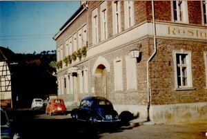 1889 wurde das Gasthaus Colin eröffnet als Restaurant und Weinhandel. Weinbau, Weinhandel und Spirituosenherstellung gehörte neben der Gaststätte bis zum Ende des Weinbaus in Bodendorf/Ahr zu den Geschäftsfeldern. 1972 Übernahm in der vierten Generation Peter Cholin das Gasthaus und beute es um. Die Fotos entstanden vor den umfangreichen Umbauten. Die Toreinfahrt wurde entfernt, eine neuen Betondecke eingezogen und die untere Etage in einen Gastraum umgestaltet. Die Außenfassade erhielt einen keramischen Belag.
