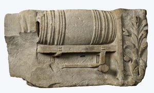 Ergänzte Gipskopie. Das Original (um 220 n. Chr.) befindet sich im Rheinischen Landesmuseum in Trier. Die Kopie aus Gips, die das berühmte Weinschiff aus Neumagen (bei Trier) zeigt, stammt aus der Gründerzeit des Weinmuseums. Bei dem stark verkleinerten Modell wurden Teile, die beim Original fehlen oder beschädigt sind, frei ergänzt. Der Stein gehörte zum Grabmal eines Weinhändlers aus dem Trierer Raum. Der Verstorbene ließ sich bei der Ausübung seines Berufes verewigen. Das Schiff mit sechs Ruderern und zwei Steuermännern transportiert Fässer mit Moselwein. Als Teil des Fundamentes der Wehrmauer der spätantiken römischen Festung Noviomagus wurde das Grabmal 1878 gefunden. Die darin enthaltenen Funde und andere, auch Fragmente weiterer Weinschiffe, sorgten wegen ihres Alters dafür, dass Neumagen heute als „ältester Weinort Deutschlands“ bezeichnet wird. Wissenschaftler und Wissenschaftlerinnen vermuten, dass es sich bei dem Weinschiff um ein ehemaliges Kriegs- oder Versorgungsschiff handelt, welches in den Besitz eines Zivilisten kam. Es existiert ein hölzerner Nachbau namens Stella Noviomagi – dieser befindet sich im Hafen von Neumagen-Dhron. Das Schiff ist das größte schwimmfähige Römerschiff, welches je im deutschen Sprachraum nachgebaut wurde. [Jonas Ehinger] Die Nachbildung war ein Geschenk von Dr. Friedrich v. Bassermann-Jordan.