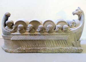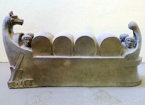 Ergänzte Gipskopie. Das Original (um 220 n. Chr.) befindet sich im Rheinischen Landesmuseum in Trier. Die Kopie aus Gips, die das berühmte Weinschiff aus Neumagen (bei Trier) zeigt, stammt aus der Gründerzeit des Weinmuseums. Bei dem stark verkleinerten Modell wurden Teile, die beim Original fehlen oder beschädigt sind, frei ergänzt. Der Stein gehörte zum Grabmal eines Weinhändlers aus dem Trierer Raum. Der Verstorbene ließ sich bei der Ausübung seines Berufes verewigen. Das Schiff mit sechs Ruderern und zwei Steuermännern transportiert Fässer mit Moselwein. Als Teil des Fundamentes der Wehrmauer der spätantiken römischen Festung Noviomagus wurde das Grabmal 1878 gefunden. Die darin enthaltenen Funde und andere, auch Fragmente weiterer Weinschiffe, sorgten wegen ihres Alters dafür, dass Neumagen heute als „ältester Weinort Deutschlands“ bezeichnet wird. Wissenschaftler und Wissenschaftlerinnen vermuten, dass es sich bei dem Weinschiff um ein ehemaliges Kriegs- oder Versorgungsschiff handelt, welches in den Besitz eines Zivilisten kam. Es existiert ein hölzerner Nachbau namens Stella Noviomagi – dieser befindet sich im Hafen von Neumagen-Dhron. Das Schiff ist das größte schwimmfähige Römerschiff, welches je im deutschen Sprachraum nachgebaut wurde. [Jonas Ehinger] Die Nachbildung war ein Geschenk von Dr. Friedrich v. Bassermann-Jordan.