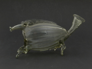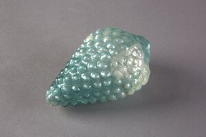 Das Gefäß aus blaugrünem Glas ist als eine sich nach unten verjüngende Weintraube geformt. Die einzelnen Trauben heben sich als kleine Buckel ab. Im 4. Jahrhundert werden Glasgefäße allmählich zum bevorzugten Trinkgeschirr und verfeinern sowohl Geschmack als auch Trinksitten. Produkte aus Trierer Glasmanufakturen verdrängen die bis dahin dominierenden Spruchbecher. Gläser waren beliebte Grabbeigaben - speziell in spätrömischen Gräbern fand man sie in vielfältigen Formen. Die einzelnen Formen beziehen sich unmittelbar auf ihren ursprünglichen Inhalt. [Jonas Ehinger]