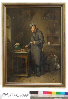 In einer düsteren Zimmerecke steht ein pensionierter Offizier in grauem Feldmantel, blauer Feldkappe und umgehängtem Schwert vor einem Tischchen mit Speisen und Getränken. Genüsslich greift er nach einem halben Brathähnchen. In dem einfachen Raum mit rohem Bretterboden stehen Tassen, Flaschen eine Gießkanne und ein Weinfaß verteilt umher. In der Ecke hängen an der Wand ein Einkaufskorb und ein Weinheber. Links unten signiert: Friedr. Friedländer 1884. Friedrich Friedländer studierte an der Wiener Akademie, dann bei Ferdinand Georg Waldmüller. Studienreisen führten ihn nach Italien (1850), Düsseldorf (etwa 1851–1854) und Paris. Zuerst Historienmaler, wandte er sich seit 1854 dem Genre zu. Er malte namentlich Szenen aus dem Wiener Volks- und dem Soldatenleben und aus dem schwäbischen Volksleben. Seine Spezialität bestand in der Schilderung des beschaulichen Lebens in Invalidenhäusern.