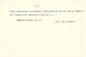 Zu sehen sind durch den Rebstichler zerfressene Elblingblätter. Die Blätter stammen aus der Anlage Temmels der preußischen Rebenveredlungsanstalt. Der Rebstichler, blaugold oder grüngold glänzend, kommt auf verschiedenen Laubbäumen vor und kann als empfindlicher Schädling an Weinreben auftreten. Durch das Zusammenrollen der Blätter werden die Reben geschwächt, sodass die Traubenansätze verdorren. Das Foto stammt aus der ehemaligen Landes-Lehr- und Versuchsanstalt (LLVA) in Bernkastel Kues.