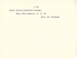 Zu sehen sind durch Mehltau (Oidium) zerstörte Weintrauben. Der Echte Mehltau der Weinrebe ist eine Pflanzenkrankheit bei Weinreben. Erreger ist der Schlauchpilz Erysiphe necator. Das Foto stammt aus der ehemaligen Landes-Lehr- und Versuchsanstalt (LLVA) in Bernkastel Kues.