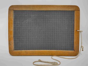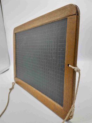 Die Schiefertafel besteht aus einer Schieferplatte, die von einem Holzrahmen eingefasst ist. In die Schiefertafel ist auf der einen Seite ein kariertes Muster und auf der anderen Seite ist eine Linierung eingeritzt, welche an die Lineatur 3 erinnert, so dass auf der einen Seite die Matheaufgaben und auf der anderen Seite die übrigen Aufgaben in der Schule bearbeitet werden konnten. Auf der Seite mit den Linien ist auch noch ein Satz zu erkennen, den eventuell der ehemalige Besitzer/ die ehemalige Besitzerin in Schreibschrift aufgeschrieben hat: "Fräulein Schäfer ist die beste Lehrerin der Weld." (Der Schreibfehler in "Welt" ist so auf der Tafel zu lesen.) Der Holzrahmen ist gesteckt und geleimt und in ihn ist ein kleines Loch gebohrt, damit dort ein Läppchen befestigt werden konnte. Bei dieser Tafel ist jedoch nur noch die Schnur des Läppchens vorhanden, das Läppchen selbst fehlt.