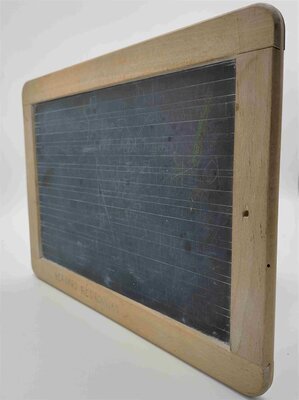 Die Schiefertafel besteht aus einer Schieferplatte, die von einem Holzrahmen eingefasst ist. In die Schiefertafel ist auf der einen Seite ein kariertes Muster und auf der anderen Seite Hilfslinien eingeritzt, so dass auf der einen Seite die Matheaufgaben und auf der anderen Seite die übrigen Aufgaben in der Schule bearbeitet werden konnten. Der Holzrahmen ist gesteckt und geleimt und in ihn ist ein kleines Loch gebohrt, damit dort ein Läppchen befestigt werden konnte. Auf der Seite mit der linierten Einritzung ist auf den unteren Tafelrahmen der Name Bernard Bédrossian in Großbuchstaben geschrieben. Das kann eventuell der Name des ehemaligen Besitzers sein. Die Tafel besitzt keinerlei Prägungen eines möglichen Herstellers.