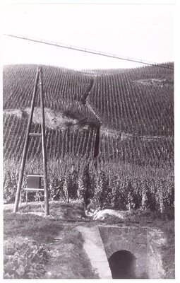Zu sehen ist ein Weingerg, welcher aus mehreren Terrassen besteht. Auf diesen Berg führt ein schmaler Pfad hinauf. Oben sind Stufen erkennbar. Ein Rohr aus Eisen verläuft parallel zum Weg. Es könnte sich um ein Geländer, oder oder die Schiene einer Monorackbahn handeln. Das Foto stammt aus der ehemaligen Landes-Lehr- und Versuchsanstalt (LLVA) in Bernkastel Kues.