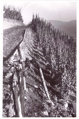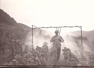 Zu sehen ist eine Bewässerungsanlage in einem Weinberg. Mehrere, miteinander verbundene, Rohre sind entlang einem Weg verlegt. Von der Seite geht ein Rohr (mit einer Wasseruhr ?) zu einer Verteilstation ab. Auch hier sind wieder mehrere Absperrventile sichtbar. Das Foto stammt aus der ehemaligen Landes-Lehr- und Versuchsanstalt (LLVA) in Bernkastel Kues