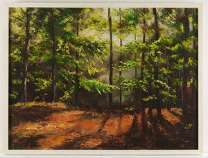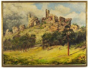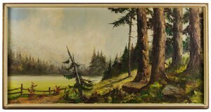 Noch unbekannte Örtlichkeit in der Pfalz mit breitem Waldweg und hohen Fichten. Signatur: °Erich Löscher 1969° °Wasgau-Maler° Löscher war gelernter Bäcker und führte die Gaststätte °Wegelnburg° in Nothweiler.