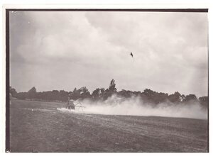 Zu sehen ist eine Maschine namens "Autofix" beim Stäuben. Es handelt sich hier um ein fahrbares Gerät, mit dem zum Beispiel Dünger oder Kalk auf die Äcker ausgebracht werden können. Das Foto stammt aus der ehemaligen Landes-Lehr- und Versuchsanstalt (LLVA) in Bernkastel Kues.