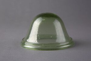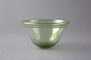 Sturzbecher sind Trinkgefäße, welche wegen ihrer Form ohne Fuß nicht abgestellt werden können. Stattdessen werden sie gestürzt, d.h. sie ruhen auf dem Trinkrand. Sie bestehen aus einem Kelchteil und einem spitz- oder rundzulaufenden Griffteil, wodurch sie nur entleert abgestellt werden können und somit zum Trinken animieren. In gefülltem Zustand müssen sie in der Hand oder einem speziellen Gestell gehalten werden. Solche Gestellte treten erst nach dem Frühmittelalter auf. Bei dem vorliegenden Sturzbecher handelt es sich um einen Tummler (auch Taumler). Durch seinen abgerundeten Boden richtet sich der kleine Becher immer wieder auf. Typisch für frühmittelalterliche Sturzbecher ist er olivgrün. Andere gängige Färbungen waren hellgrün, gelb oder blaugrün. Hierbei handelt es sich für gewöhnlich um natürliche Färbungen, die auf verunreinigten Quarzsand zurückzuführen sind, welcher für die Herstellung benötigt wurde. Allerdings konnte die Farbe auch gezielt erreicht werden, z.B. durch die Zugabe von Kupferoxiden. [Jonas Ehinger]