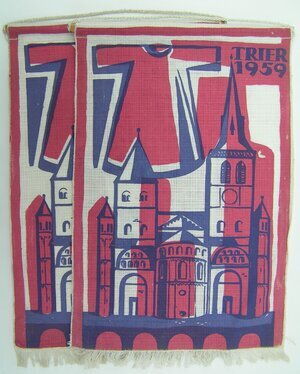 Zwei gleiche hochrechteckige kleine Wallfahrtsfahnen aus Leinen; sie sind in den Farben Rotbraun, Flieder und Dunkelblau bedruckt und zeigen im Vordergrund den Dom zu Trier, darüber schwebt auf der linken Seite der ausgebreitete heilige Rock. Rechts daneben befindet sich die Inschrift "TRIER 1959". Oben ist jeweils ein an den Seiten offener Saum umgenäht, durch den ein viereckiger Holzstab gesteckt ist. An dessen beiden Enden ist eine weiße gedrehte Kordel zum Aufhängen der Wallfahrtsfahne befestigt. Unten franst der Stoff aus Die Rückseiten sind nicht bedruckt, allerdings schimmert das Bildmotiv durch. Auf einer der beiden Fahnen klebt unten links ein kleines, an den Rändern gezacktes Papieretikett mit der Aufschrift in Bleistift "Handarbeit 4,50 [DM]"