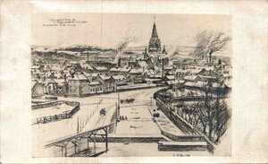 Die Vorderseite der Postkarte zeigt den Druck einer Tuschezeichnung des Kriegsverwundeten Ernst Müller-Gräfe. Oben links bezeichnet: "Kaiserslautern von der Rupprechtschule aus gesehen" und die Signatur "Ernst Müller-Gräfe, Dresden". Die Zeichnung ist unten rechts datiert: "d. 15. Jan. 1917". Dargestellt ist eine Teilansicht der Stadt Kaiserslautern mit Blick auf die Apostelkirche. Der Zeichner hat seinen Standpunkt in der damaligen Rupprechtschule. Die Rupprechtschule war 1917 ein Lazarett, in dem der Künstler Ernst Müller-Gräfe eine Kriegsverletzung auskurierte. Beschriftung auf der Rückseite: "Nach einer Zeichnung des Kriegsverwundeten Ernst Müller (Lazarett Rupprechtschule in Kaiserslautern) Geschenk des Herrn Magenau". Ernst Müller-Gräfe (* 20. Juli 1879 in Nobitz; † 14. Februar 1954 in Altenburg/Thüringen) war ein deutscher Maler und Grafiker, dessen Werke in der NS-Zeit zunächst als "entartet" gebrandmarkt wurden. [Ludger Tekampe / Robin Volk] (Danke an Herrn Dr. Roland Rappmann für freundliche Hinweise zum Künstler.)