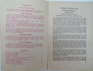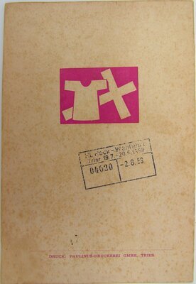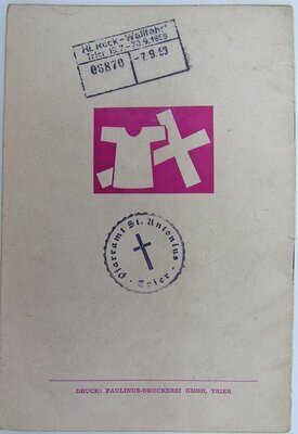Drei gleiche Pilgerbüchlein mit Gebrauchsspuren und fehlendem Andenkenbild (vgl. IZ 1476 2021), herausgegeben vom Generalvikariat Trier anläßlich der Ausstellung des Heiligen Rocks im Trierer Dom 1959. Das Deckblatt zeigt holzschnittartig in rosaroter Farbe ein Brustbild von Jesus Christus, der seine rechte Hand wie zur Segnung vor den Oberkörper hält. Sein Kopf ist von einem Heiligenschein umgeben, dahinter ist in Kreuz angedeutet. Entworfen hat das Titelbild der Trierer Künstler Reinhard Hess (1904-1998) als Vorhang für den Trierer Dom, der während der gesamten Wallfahrt hinter dem Heiligen Rock hing. Das Titelbild ist oben und unten von der Inschrift umgeben: "JESUS CHRISTUS IST DER HERR / HEILIG-ROCK-WALLFAHRT / TRIER 1959 /PILGERBÜCHLEIN". Auf der Rückseite ist das Motiv des offiziellen Wallfahrtsansteckers mit dem ausgebreiteten heiligen Rock und einem liegenden Kreuz gedruckt sowie unten: Druck: Paulinuns-Druckerei GmbH, Trier. Das Pilgerbüchlein enthält zu Modalitäten für die Erlangung von Ablässen, eine Botschaft des heiligen Vaters, Papst Johannes XXIII., ein Grußwort des Bischofs Matthias [Wehr], Pilgergebete und Fürbitten, eine lateinische Messe und deutsche Gebete zum heiligen Rock, eine Andacht und ein Rosenkranz sowie Lieder zur Heilig-Rock-Wallfahrt. Das Heft umfasst 35 Seiten inklusive des vorderen Deckblattes. Die Rückseiten beider Hefte sind mit den Tagesstempeln "04020 / 2.8.59" (Foto 3/5), "08870 / 7.9.59" und weiterer Stempel des Pfarramtes St. Antonius Trier (Foto 2/5) und "00067 / 18.9.59" versehen (Foto 4/5).