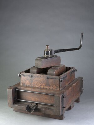 Bei der Handkelter handelt es sich um eine viereckige Spindelkelter. Hergestellt wurde sie vom Winzer und Küfer Karl Becker aus Klingenmünster. Die Kelter steht auf zwei Kufen. Der massive Bietkasten hat vorne und hinten rundeiserne Verstrebungen. Der Ablauf aus dem Eisenblech ist vorne aufgeschoben und die vier losen Seckerbretter sind seitlich mit Haken zu befestigen. Die eiserne Spindel mit Bronzemutter findet sich zentral und wird von einem eisernen Handgriff angedreht. Somit wird Druck auf den kleinen darunterliegenden Pressbalken ausgeübt, welcher folglich diesen Druck auf vier mal zwei weitere kleine Pressbalken beiderseits der Spindel nach unten weitergibt. Das Holz ist dunkelbraun gebeizt, das Eisen schwarz lackiert. Auf dem Kopfbalken findet sich die Hausmarke. Spindelkeltern wurden von Kleinwinzern benutzt, welche keine großen Mengen an Maische abpressen mussten. Es gibt zwei Arten von Spindelpressen: mit feststehender Spindel und beweglicher Schraubenmutter, oder aber mit beweglicher Spindel und feststehender Schraubenmutter. Durchgesetzt hat sich Erstere, ebenso wie runde Spindelkeltern, da sie bei geringerem Materialaufwand höheren Druck aushalten als viereckige Keltern. Die Druckvorrichtung der Spindelkeltern ist entweder einfach- oder doppeltwirkend. Doppeltwirkend bedeutet, dass der Druck sowohl im Vorwärts- als auch Rückwärtsgang ausgeübt wird, während einfachwirkend nur den Druck im Vorwärtsgang beschreibt. [Jonas Ehinger]