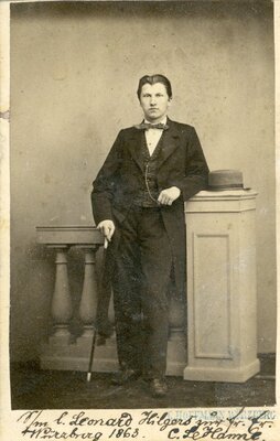 Frontal Fotografie eines stehenden Herren , der sich entspannt an eine Studiobalustrade lehnt. Er blick aus seinem ovalen Gesicht mit hohen Geheimratsecken direkt in die Kamera. Seine halblangen sind nach hinten gekämmt. Er trägt eine dunkle Hose und gepunkte Weste unter einem dunklen Gehrock. Seine rechte Hand hält einen dunklen Spazierstock mit hellem Knauf und Spitze. Auf der Balustrade liegt sein gerader Hut. Unter dem Bild mit Tinte geschrieben: S/m l.Leonard Hilgers zur fr. Er. Würzburg 1868 C. Le Hame Darunter blau gestempelt: C. Hoffmann Würzburg