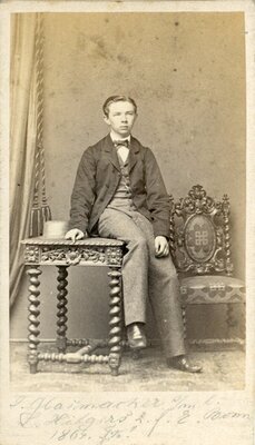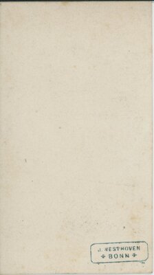 Fotografie eines, auf einem mit Schnitzwerk stark verzierten Tisch, sitzenden sehr jungen Herren. Die Beine des Tisches sind spiralförmig gearbeitet, auf der Tischplatte liegt ein gerader Hut. Der Herr trägt helle Hosen und Weste und einen dunkleren Mantel, über dem hellen Hemdkragen sieht man eine Fliege. Er hat kurze nch hinten gekämmte Haare und schaut mit seinem beinah kindlichen Gesicht nach rechts aus dem Bild. Sein elinkes Bein berührt den Boden, das Rechte schwingt frei. Unter dem Bild mit Bleistift: J. Glasmacher s/m l. L. Hilgres z.f. E. Bonn 1864 Verbindung-Zirkel Auf der Rückseite grün gestempelt: J. Westhoven Bonn