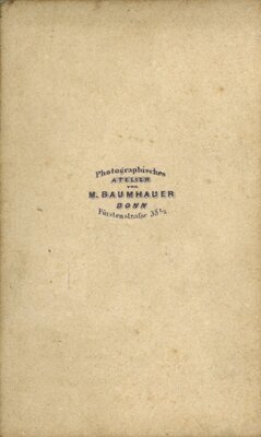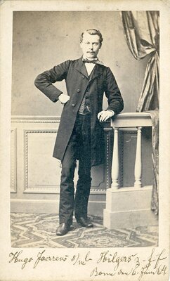 Fotografie eines stehenden, sehr schlanken Jungen Herren in dunklen Hosen, Weste und Mantel. Auf dem hellen Hemdkragen trägt er eine gemusterte Fliege. Seinen rechten Arm hat er mit der Faust in die Hüfte gestemmt, seine Linke ruht auf einer zierlichen Balustrade hinter der ein Vorhang zusehen ist. Er schaut ein bisschen Streng direkt in die Kamera. Seine kurzen Haare sind nach hinten gekämmt, auf der Oberlippe hat er einen zarten Bart. Unter dem Bild mit Tinte: Hugo Jaerreus s/m l Hilgres Bonn den 6. Juni 64 Auf der Rückseite: Photographisches Atelier von M. Baumhauer Bonn Fürstenstraße. 38 ½