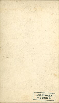 Fotografie eines, sich an einen Pfosten lehnenden jungen Herren. Er ist mit einer dunklen Hose, Weste und einem dunklen Gehrock bekleidet und auf der Weste ist eine Kette und schmale Schärpe zu sehen. Auf dem liegen eine flache Mütze und ein Spazierstock. Seine glatten sind links gescheitelt und zur Seite gekämmt. Im Hintergrund sind ein Vorhang und eine Balustrade zu sehen. Unter dem Bild mit Tinte geschrieben: P. Broicher s/l Hilgers z. f. Er. Bonn 1864 Stud. Verb. Zirkel Auf der Rückseite: grün gestempelt J. Westhoven Bonn