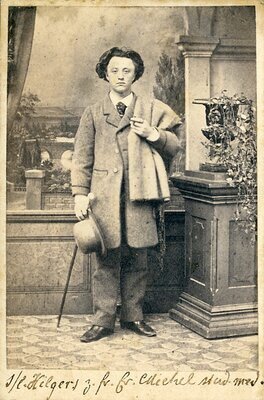Studioaufnahme eines klein wirkenden stehenden jungen Herren, der einen hellen Mantel aus Loden ähnlichem Stoff trägt, dessen Kanten dunkel abgesetzt sind. Seine Hosen wirken ähnlich. In seiner rechten Hand hält er einen Hellen Hut und einen Spazierstock. Über seiner linken Schulter liegt ein nicht zu erkennendes Kleidungsstück oder Stoff. Sein feines, etwas flaches Gesicht blickt den Betrachter ein bisschen traurig an. Hat kräftige, etwas ungebändigte dunkle mittellange Haare, die seinen Kopf wie eine Wolke umgeben. Unter dem Bild mit Tinte : s/l Hilgres z. fr. Er. Michel stud. med. Die Rückseite ist leer.