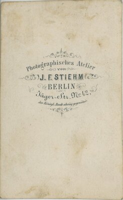 Fotografie eines stehenden, jungen Herren in dunklem Mantel und Hose. Er steht vor einem einbeinigen Tisch und neben einer hellen Balustrade. Links im Bild hängt ein Vorhang mit Posamenten. Der linke Arm des Herren hängt herab, seine recht Hand hat er, in Bauchhöhe in seinen Mantel geschoben. Er ist bartlos hat sein dunkles Haar nch hinten gekämmt und trägt eine zierliche Brille. Er blickt nach links aus dem Bild. Unter dem Bild mit Tinte geschrieben: Dr. Chr. Fingers s/l L. Hilgers, unleserlich, zr. fr. Er. 9/3 65 Auf der Rückseite: photographisches Atelier von J: F: STIEHM BERLIN Jägerstr. 42 der königlichen Bank schräg gegenüber